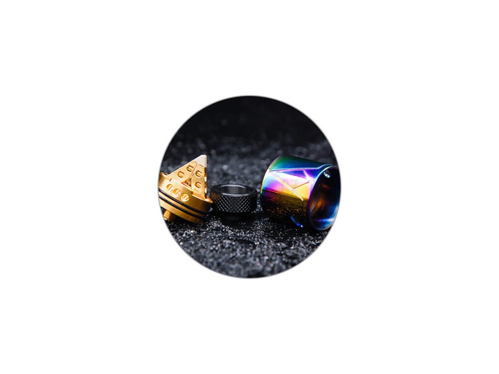 Celé tělo je vyrobeno z kvalitní nerezové oceli, která je doplněna pozlacenou základnou ve tvaru pyramidy a pozlaceným 510 závitem ve spodní části. Na závitu se objevuje BF pin pro kompatibilitu se squonk mody. Díky tomu tak můžete využívat Smokjoy Pyramid nejen na standardní mody se závitem 510, ale také na čím dál tím populárnější squonkery s velkou kapacitou na e-liquid. Povrch atomizéru je lesklý a působí skutečně luxusním dojmem, který jen umocňují kvalitní použité materiály.