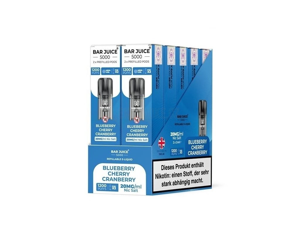 Parametry a specifikaceVýrobce: Bar Juice Žhavící hlava: Integrovaná v Podu Materiál spirálky: Mesh Objem: 2ml Styl potahování: MTL (Mouth-to-Lung) Příchuť: Blueberry Cherry Cranberry (Borůvka, Třešeň, Brusinka) Obsah nikotinové soli: 20mg/ml Způsob plnění: Nelze, již předplněné Legislativa: TPD kompatibilní
