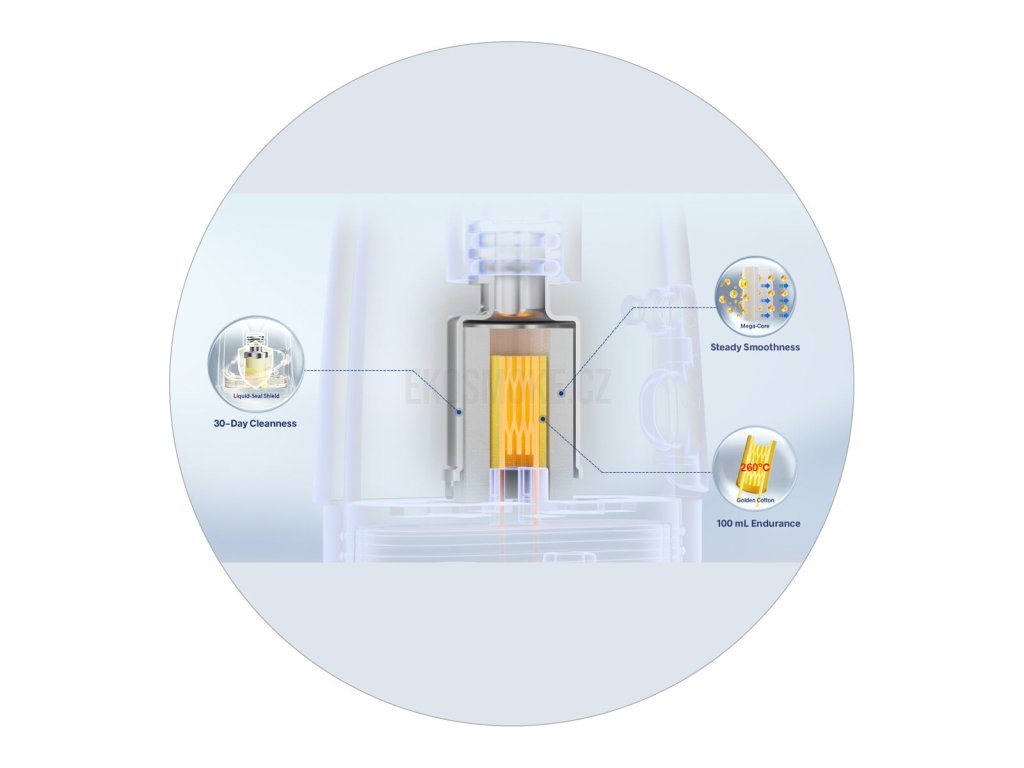 Cartridge VooPoo Argus Pod Top Fill V2 přichází s technologií iCOSM Code 2.0, v jejich centru se nachází moderní široké Mega-Core jádro a speciální izolační štít (Liquid-Seal Shield) pro efektivní a rovnoměrné zásobení vaty e-liquidem. Tento štít dokáže rovnoměrně nasát e-liquidem až 99% povrchu vaty uvnitř jádra. Mesh pletivo je potom obaleno inovativní a patentovanou zlatou vatou (Golden Cotton), která maximalizuje absorpci a prodlužuje životnost cartridge díky odolnosti vůči teplotě na spirálce až do 260 °C.