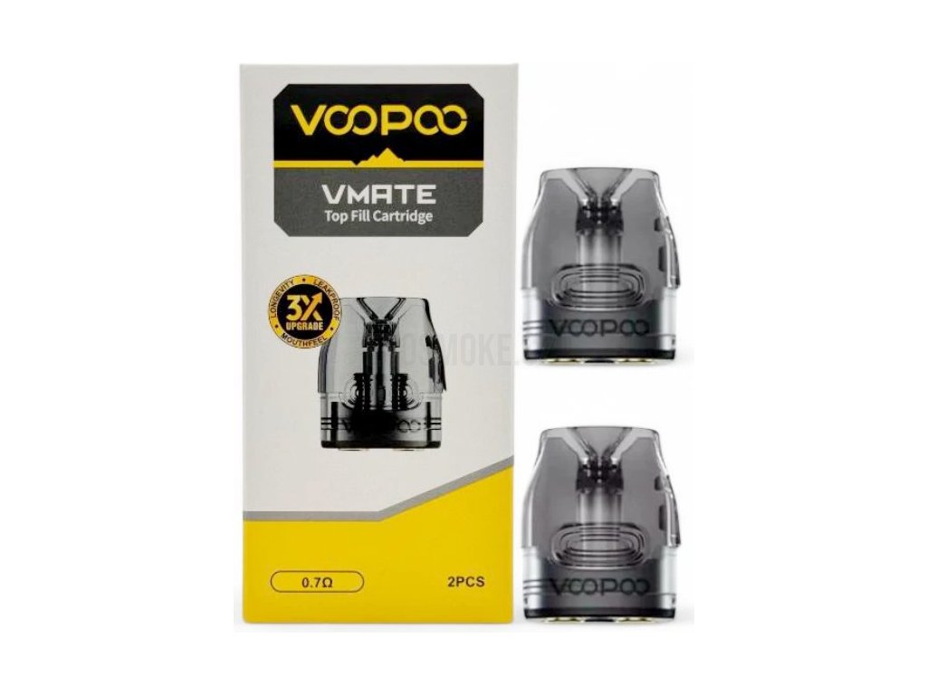 Cartridge VOOPOO VMATE TOP FILL s vrchním plněním o objemu 3ml a odporu 0,7ohm. Cartridge je plně kompatibilní s VMATE V2. Balení obsahuje 2ks