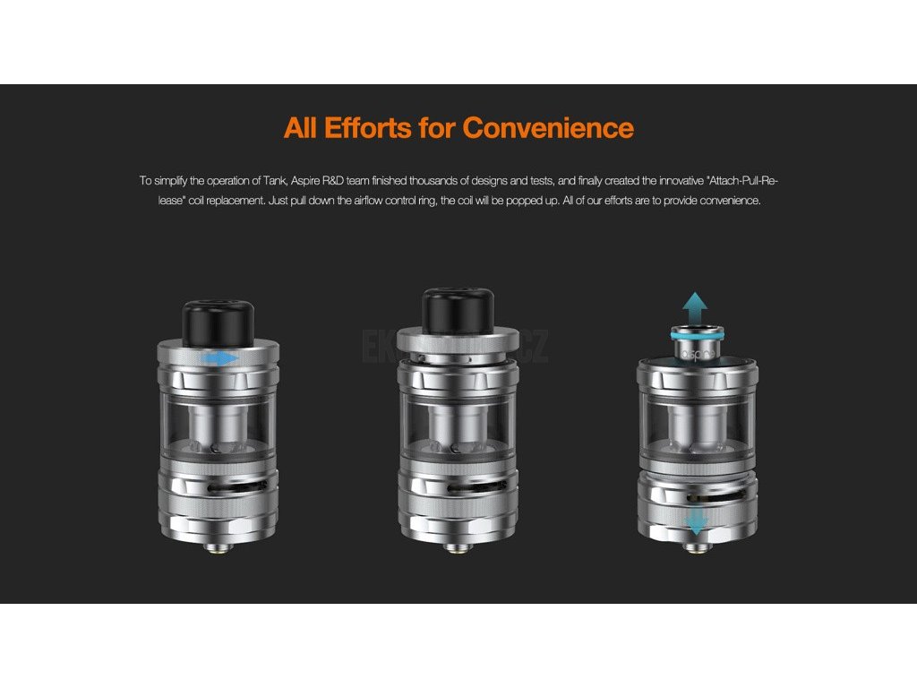 Aspire je jeden z velkých výrobců, který od roku 2013 posouvá dopředu zařízení, ale i způsob vapování. Aspire první představil takzvané BVC hlavy. Aspire se zaměřoval na tyl kouření pusa-plíce, ale jako první přišel s nízkoodporovým tankem. Aspire dále pokračuje na pevných základech. Aspire má pro začátečníky skvělé sady, pokročilí si užijí novou řadu nízkoodporových tanků