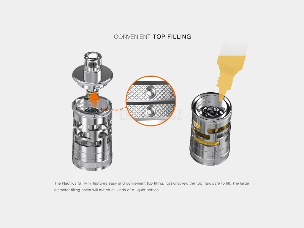 aSpire Nautilus GT Mini osloví především příznivce klasického MTL šlukování. Je postaven na kvalitní základně z ušlechtilé oceli, která je doplněna o kvalitní pyrexové sklo. Celkový objem pro náplň tak činí až 2,8 ml zásobního prostoru. Nastavitelný přívod vzduchu (Airlow) je samozřejmostí, a to v dokonalém provedení, které je přesně odstupňované celkem pěti různě velikými průchody. Průchod vzduchu může být také celkově uzavřen. Díky tomu to provedení je Nautilus GT Mini primárně určen pro klasický styl potahování MTL, jaký známe u klasických cigaret, nicméně v kombinaci se správně zvolenou žhavící hlavou a při plném otevření přívodu vzduchu lze snadno použít i pro přímý styl potahování do plic (DL). Vše završuje tolik oblíbený systém horního plnění, kdy stačí pootočit horní částí Clearomizeru a jednoduchým způsobem jí vytáhnout. K dispozici jsou dva dostatečně velké plnící otvory, kterými se plnění stane rychlou a jednoduchou záležitostí. K případné výměně žhavící hlavy stačí odšroubovat spodní základnu a samotné výměně už nic nebrání.