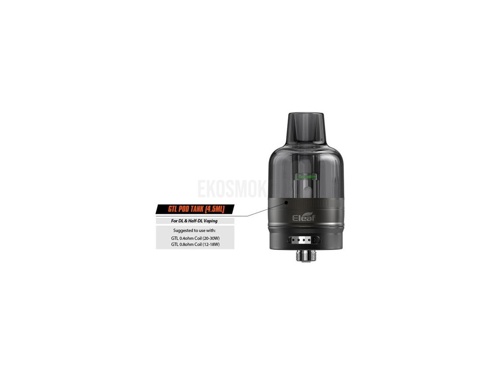Upozornění: Clearomizér Eleaf GTL Pod Tank s objemem 4,5 ml je doporučeno používat se žhavícími tělísky Eleaf GTL s odpory 0,4 ohm a 0,8 ohm.