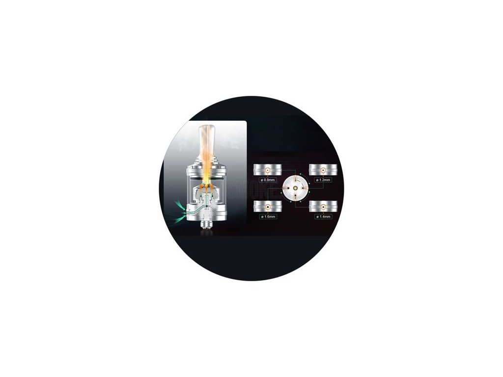 Propracovaný a intuitivní systém proudění vzduchu je jedním z klíčových prvků celého atomizéru. Na těle se nachází celkem čtyři nezávislé a individuální otvory pro přívod vzduchu s průměry 0,8 mm, 1,2 mm, 1,4 mm a 1,6 mm. Prostým otáčením kroužku pro regulaci airflow si tak zvolíte požadovaný průměr vzduchového otvoru a můžete si vychutnat tuhost potahu přesně podle svých představ.