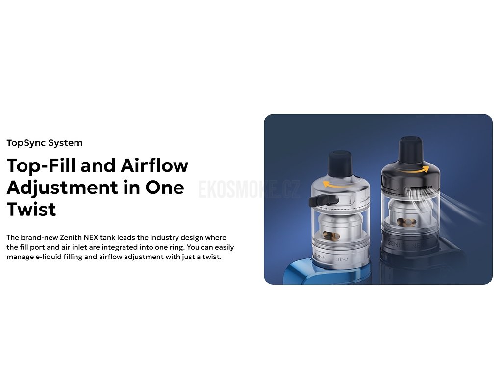 Zenith Nex se vyznačuje promyšleným ergonomickým designem a pokročilými technologickými řešeními, které z něj činí ideální volbu pro každodenní použití. Robustní materiálové složení zahrnuje vysoce kvalitní nerezovou ocel odolnou proti korozi a opotřebení, zatímco borosilikátové sklo poskytuje bezpečné a hygienické uložení e-liquidu s možností sledování aktuální hladiny. Nastavitelný přívod vzduchu umožňuje precizní regulaci intenzity potahů od úzkých MTL po volné DL potahy. Standardní 510 závit garantuje univerzální kompatibilitu s většinou moderních modů a gripů na trhu. Systém plnění shora eliminuje možnost vytékání a umožňuje rychlou výměnu příchutí bez nutnosti demontáže celého tanku. Díky náhradnímu skleněnému tělu v balení máte zajištěnu dlouhodobou funkčnost. Zenith Nex je tak perfektním řešením pro vapers hledající spolehlivost, kvalitu a univerzálnost v jednom zařízení s možností přizpůsobení různým vapovacím stylům a preferencím.