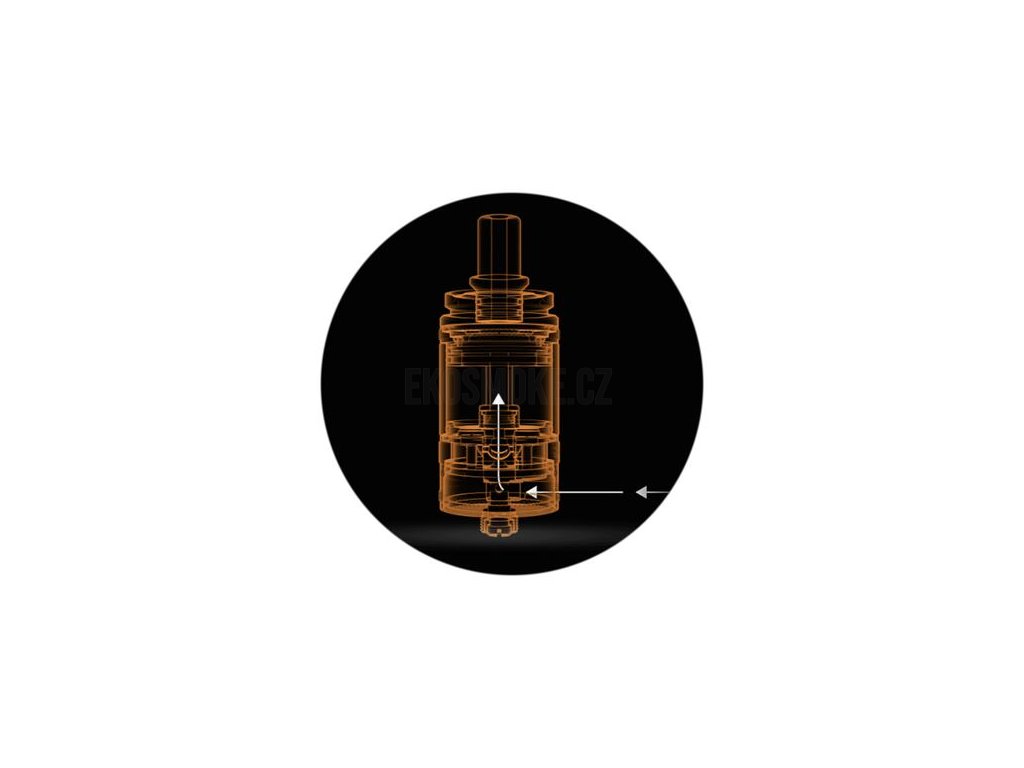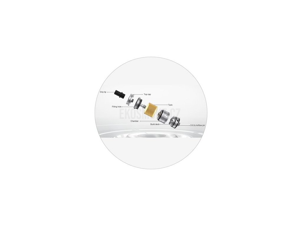Systém pro přísun vzduchu se nachází ve spodní části. Přímo pod základnou se nachází kroužek pro regulaci, celkový vstup vzduchu pak můžete ještě dotáhnout pomocí vzduchových vložek, které se instalují do závitu 510 ve spodní části. V balení na vás čekají vložky s průměry 0,8 mm, 1,0 mm, 1,3 mm, 1,6 mm, 2,0 mm a 2,5 mm, možnosti jsou tak velice rozsáhlé.