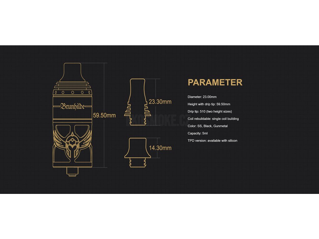 Špičkový RTA atomizér Vapefly Brunhilde, speciálně navržený pro MTL vapování. Vyroben z kvalitní nerezové oceli a rozměrech 59,5 x 23mm. Objem 5ml, závit 510. Top Coiler (Žhavící spirála se nachází v horní části atomizéru). Regulace Airflow.