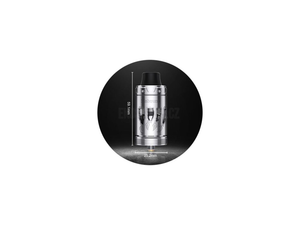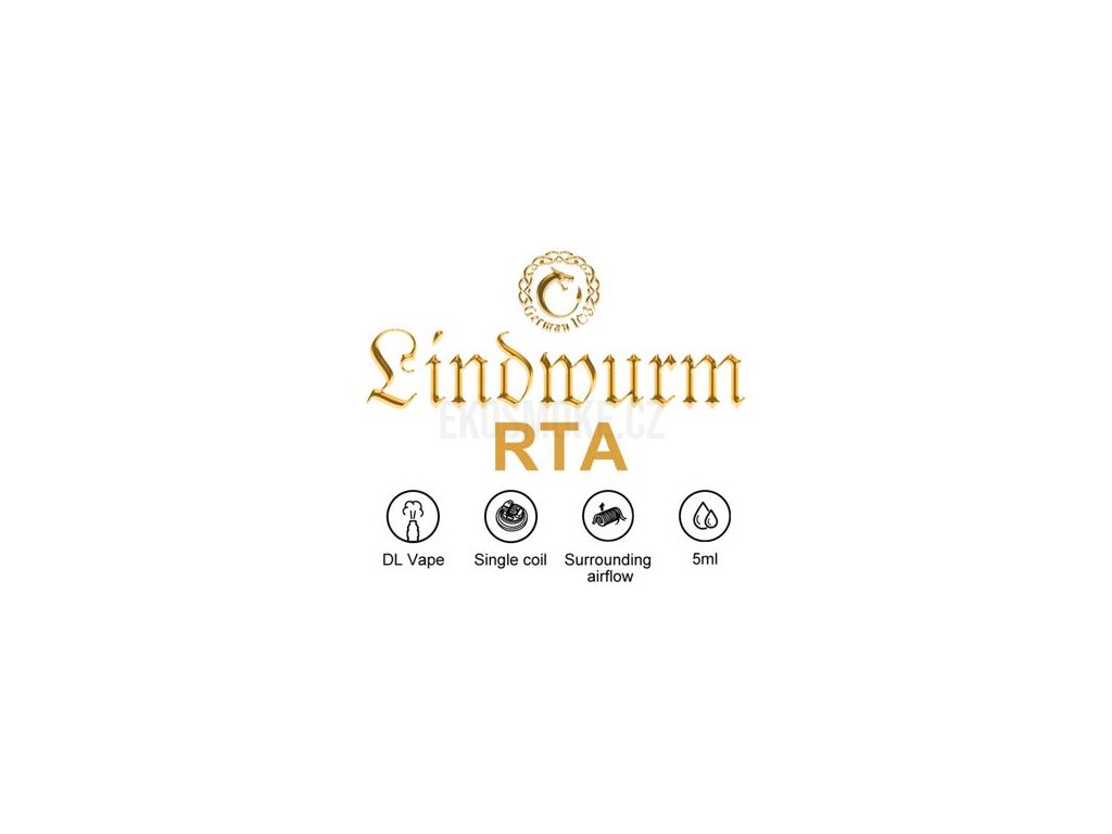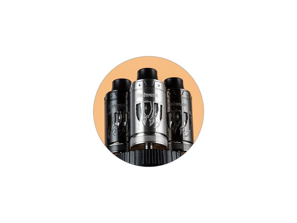 Clearomizér nabídne průměr 25,5 mm a délku jen 59,1 mm. Ve vrchní části je osazen náustkem s uchycením typu 810 a jeho spodní část zdobí závit typu 510 pro plnou kompatibilitu s většinou modů na dnešním trhu. Clearomizér Lindwurm RTA nabídne také obrovský objem tanku, ten pojme až 5 ml e-liquidu. Je navíc vybaven snadným a praktickým systémem doplňování, postačí pouze pootočit vrchním uzávěrem a můžete začít plnit. V jádru atomizéru se potom nachází základna pro jednu spirálku s precizně navrženou konstrukcí pro co nejjednodušší a nejrychlejší osazení. Celý atomizér nabuildujete už za několik málo minut. Spojení unikátního systému airflow a kvalitně zpracované konstrukce je zkrátka neodolatelné, s atomizérem se budete zaručeně vyjímat. K dostání je ve třech stylových a konvenčních barvách, z nichž si zaručeně vybere každý milovník DL potahu.