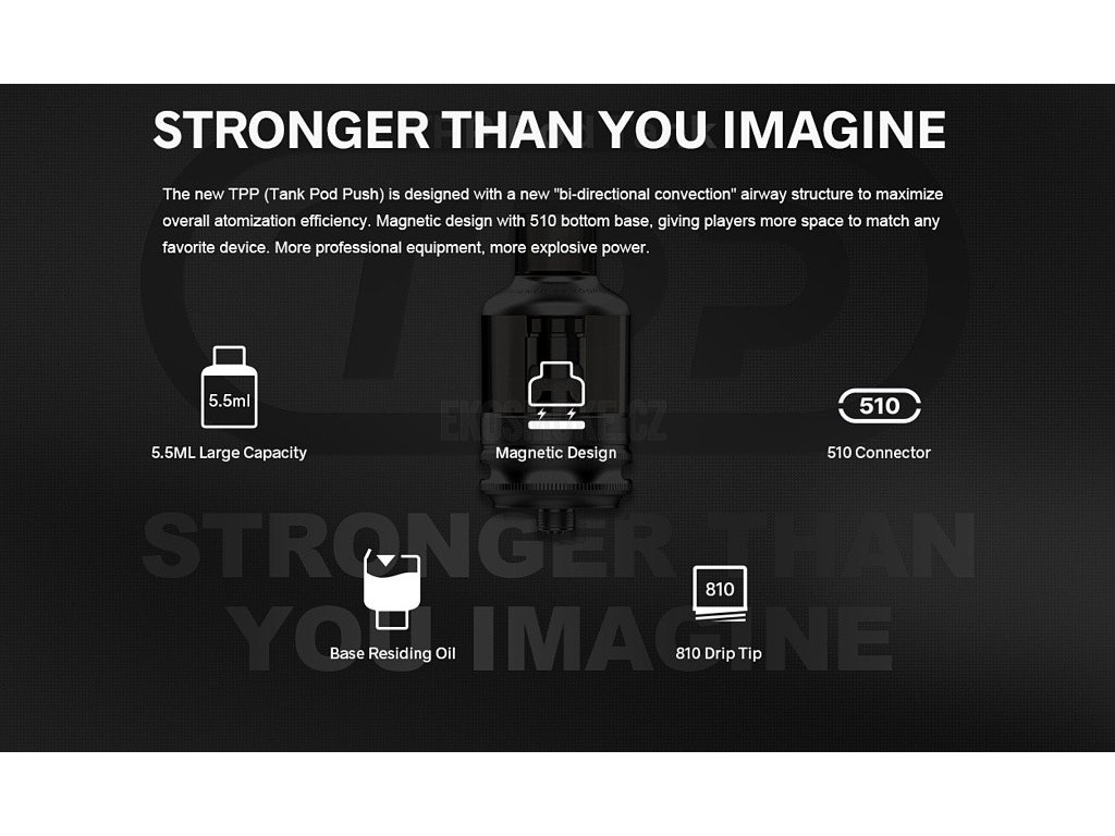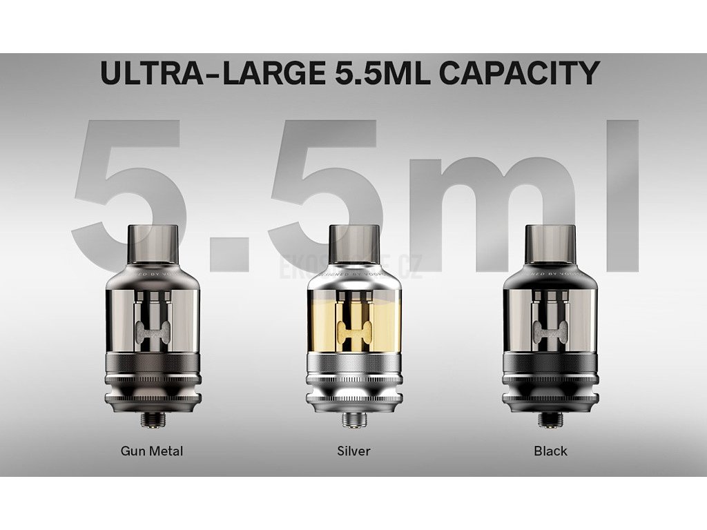 Špičkový propracovaný Pod Clearomizer o objemu 5,5ml a vyměnitelnou Pod cartridgí TPP s podporou stejnojmenných žhavících hlav Voopoo TPP, plně kompatibilní s Cartridgemi Voopoo Pnp, závit 510, Regulovatelné Airflow, vhodný pro DL styl vapování. 2x žhavící hlava Voopoo TPP DM1 0,15ohm a DM2 0,2ohm v SETU. Vyměnitelný náustek (Drip Tip) 810.