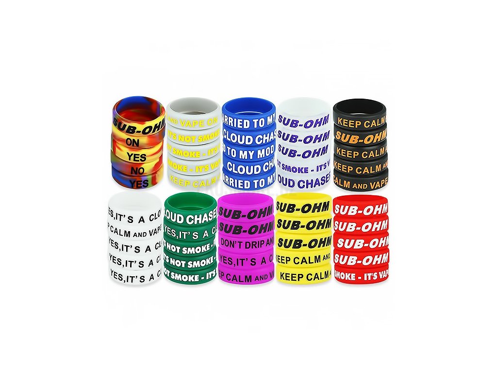 Designový silikonový kroužek je vhodný nejen jako designový doplněk Vaší elektronické cigarety, nebo gripu. Poslouží zároveň jako funkční ochrana Vašeho skleněného Clearomizeru, například při pádu na zem. Tento kroužek je určený pro baterie, případně Clearomizery s průměrem 23 mm. Potisk kroužků je opatřen náhodným textem, který se nemusí vždy shodovat s uvedenou fotografií.