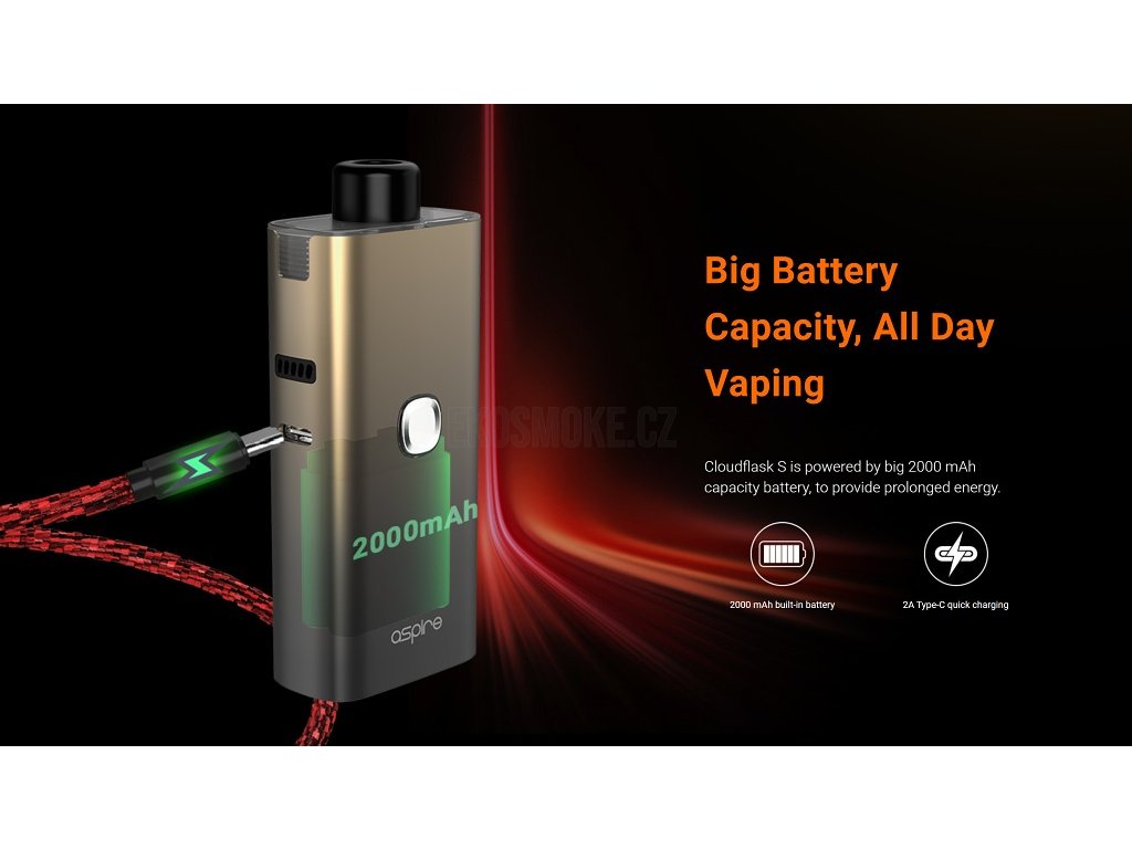 Cloudflask S je vylepšením revolučního sub-ohmového pod systému Aspire Cloudflask. Jednoduchý a snadno použitelný pod systém s vyměnitelnými žhavícími hlavami, který je navržen tak, aby produkoval ještě více páry. Cloudflask S disponuje integrovanou interní baterií s kapacitou 2000 mAh. Tato vysoká kapacita zaručuje bezproblémové celodenní vapování. Objem Pod cartridge 2ml, rychlé USB-C nabíjení, LED indikace stavu nabití. Bezpečnostní ochrana čipové sady Aspire ASP, 2x žhavící hlava v SETU. Tato cigareta je vhodná pro DL vapování.