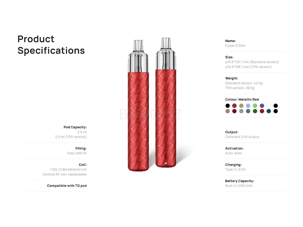 Designově se Aspire Cyber G Slim odlišuje od běžných elektronických cigaret díky svému elegantnímu a minimalistickému vzhledu s povrchem příjemným na dotyk. Absence displeje a složitých nastavení podtrhuje filozofii jednoduchosti - stačí nabít, naplnit a vapovat. 2ml Pod Cartridge se silikonovou krytkou pro snadné plnění je navržena pro optimální komfort při potahování pusa-plíce (MTL). Integrovaná žhavící hlava eliminuje nutnost složité výměny spirálek, při opotřebení jednoduše vyměníte celý pod za nový. Magnetický kontakt zajišťuje spolehlivé připojení a snadnou manipulaci. Aspire Cyber G Slim je vyrobena z kvalitních materiálů, které zaručují dlouhou životnost a odolnost proti každodennímu používání. Balení obsahuje vše potřebné pro okamžité zahájení vapování - elektronickou cigaretu, náhradní pod a USB-C kabel. Tato elektronická cigareta představuje perfektní vstupní bod do světa vapování nebo spolehlivého každodenního společníka pro ty, kteří preferují jednoduchost a spolehlivost před složitými funkcemi a nastaveními moderních vape zařízení.