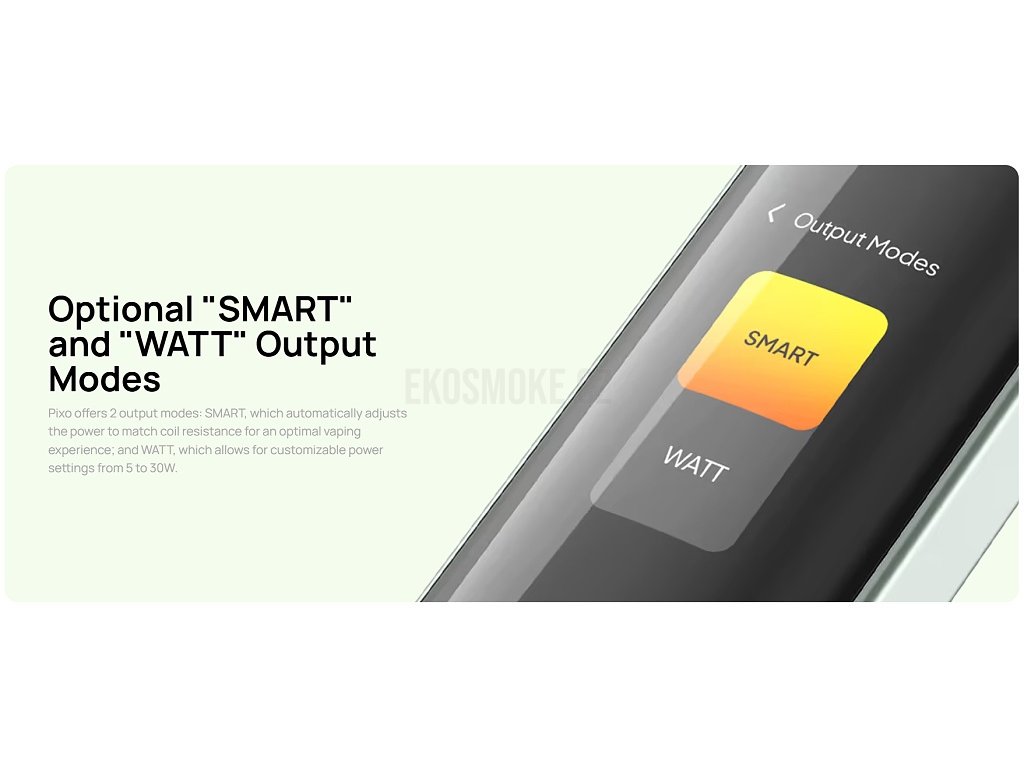 Uživatelské rozhraní, režimyIntuitivní ovládání pomocí dotykového displeje nabízí dva hlavní režimy: Smart režim pro automatické nastavení výkonu podle detekované žhavící hlavy a Watt režim pro manuální kontrolu. Přepínání mezi režimy je jednoduché a intuitivní. |