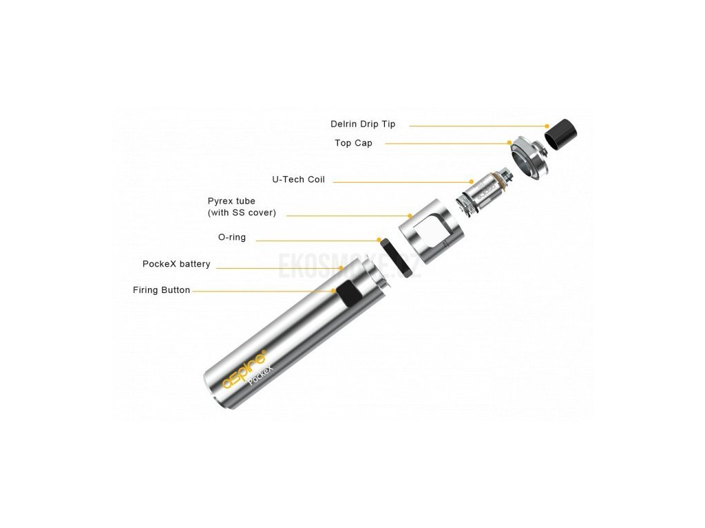 PockeX AIO je jednoduchá a výkonná ALL in ONE elektronická cigareta od společnosti aSpire. Svými vlastnostmi uspokojí jak úplné začátečníky, tak i zkušené uživatele, kteří si chtějí prožít vaping bez jakéhokoli nastavování (výkon je nastavován automaticky v závislosti na zvoleném odporu atomizeru). Vrchní plnění pojme až 2ml liquidu s možností vyjmutí clearomizeru pro snadnou údržbu. Žhavicí hlava se skrývá pod širokým náustkem, který přináší ještě větší množství páry. Nové hlavy PockeX používají technologii U-Tech, tj. dvě vertikální spirálky vedle sebe, kde vzduch prochází postupně oběma spirálkami = velké množství páry a autentická chuť liquidu. Vestavěná baterie disponuje kapacitou 1500mAh. Nabíjení umožňuje micro USB vstup (e-cigaretu lze používat i při nabíjení).