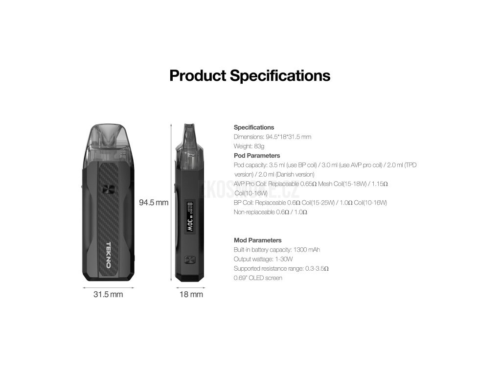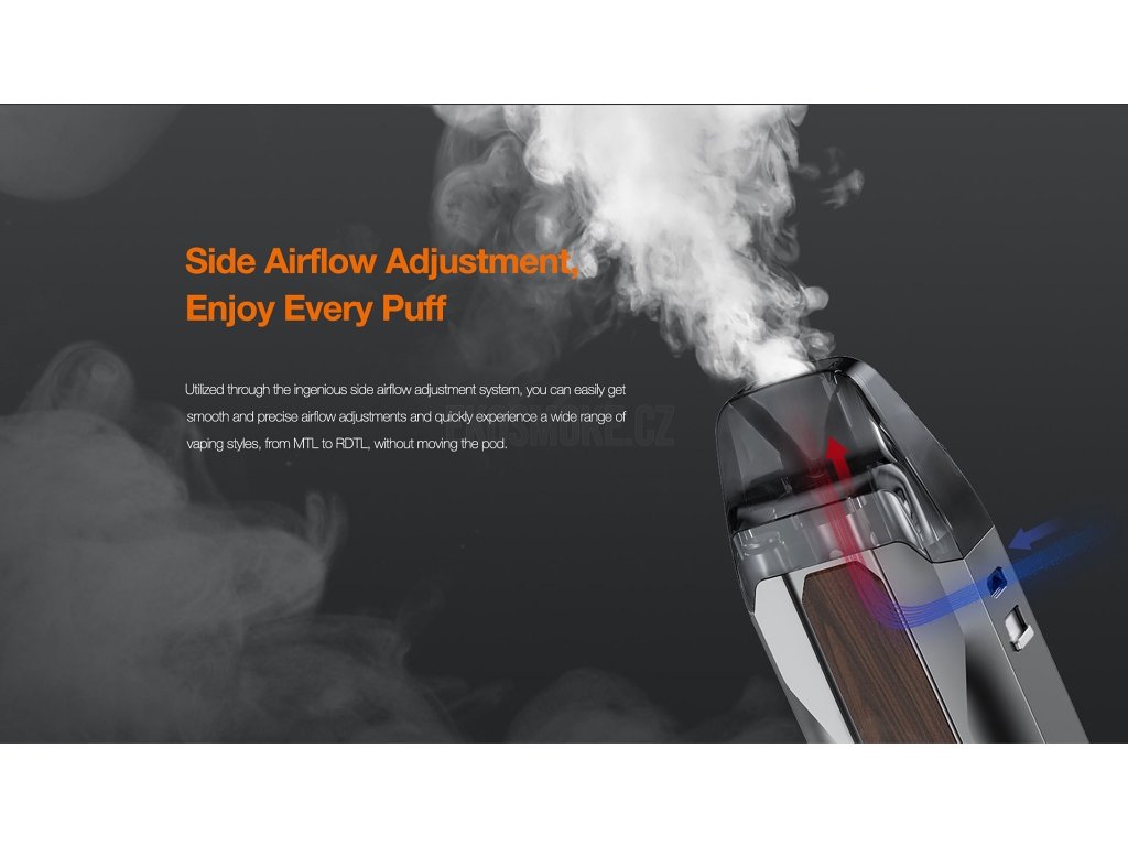 Výkonná Pod elektronická cigareta s kapacitou baterie 1300mAh, výkonem až 30W a displejem o velikosti 0,69 ”. Tělo vyrobeno ze zinkové slitiny. Vhodná pro MTL i RDTL styl vapování. Automatická i manuální aktivace baterie. USB-C nabíjení.