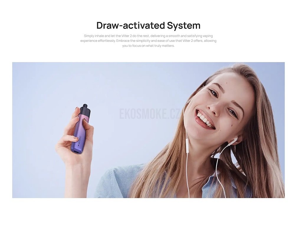 Intuitivní ovládáníS Aspire Vilter 2 můžete naprosto zapomenout na složitá menu a zdlouhavé nastavování parametrů. Zařízení funguje na principu automatického žhavení aktivovaného potahem – jednoduše si přiložíte náustek ke rtům, lehce potáhnete a okamžitě se začne vytvářet hustá pára. Není zde žádné tlačítko k mačkání, žádné režimy k přepínání. |