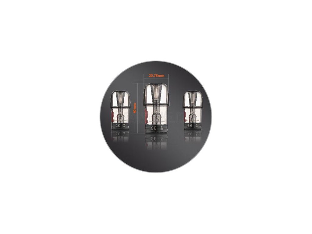 Ve vrchní části se nachází cartridge ze série dotPod Nano. Tato cartridge nabídne základní objem 2 ml a praktické boční plnění se silikonovou záslepkou. V základním balení potom najdete hned dvě tyto cartridge s rozdílnými odpory integrovaného tělíska. První z nich nabídne odpor 0,8 ohm a je vhodná pro vzdušnější klasické šlukování a použití náplní s volným nikotinem. Druhá cartridge disponuje odporem 1,0 ohm a je ideální pro nikotinové soli a utažený MTL vaping.