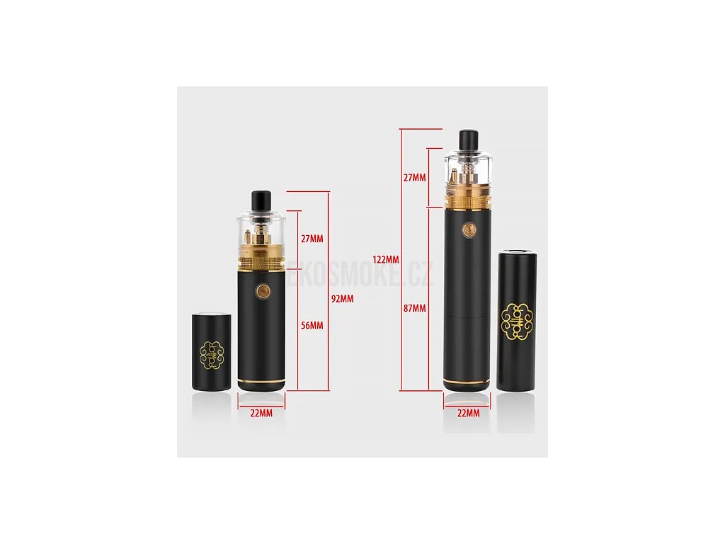 Rozměry Dotmod DotStick jsou velice kompaktní a s průměrem 22 mm a délkou 91 mm se jistě pohodlně vejde do každé kapsy. S použitím baterie typu 18650 se její délka díky nástavci prodlužuje, ale i tak jde o solidních 121 mm. K ovládání celé cigarety slouží pouze jedno hlavní tlačítko, které se svým zlatým provedením dominuje boční straně elektronické cigarety. Toto tlačítko slouží nejen k vypínání a zapínání cigarety, ale také k samotnému žhavení a nastavení změny výkonu.