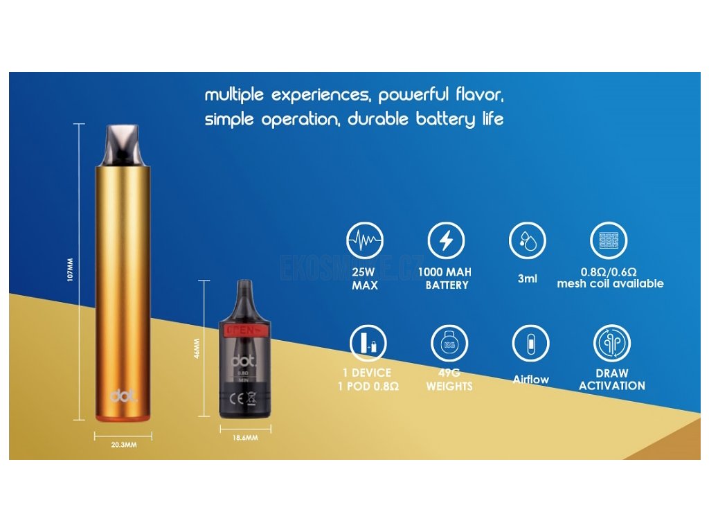 Dotmod Switch R Pod Kit přináší originální kombinaci stylového trubkového designu s moderní pod technologií. Tento prémiový model zaujme především svým automatickým provozem až do 25W a integrovanou baterií o kapacitě 1000mAh pro dlouhodobé vapování bez přerušení. Elegantně zpracované tělo z anodizovaného hliníku s rozměry 107 × 20,3 mm zajišťuje pohodlné držení v dlani a jednoduchou přenosnost. Zařízení disponuje praktickou LED indikací stavu baterie a rychlým USB-C nabíjením. Srdcem celého systému je Pod Cartridge s objemem 3ml s integrovanou mesh žavící hlavou 0,8Ω, která garantuje vynikající podání chuti při MTL potahování. Unikátní vlastností je spodní mechanická regulace airflow pomocí páčky, která umožňuje přesné doladění tuhosti potahu podle individuálních preferencí. Model je ideální pro všechny vapery preferující klasické šlukování s důrazem na komfort, kvalitu a stylový vzhled. Dotmod Switch R představuje dokonalé řešení pro začátečníky i pokročilé uživatele hledající spolehlivou elektronickou cigaretu s výjimečným designem.