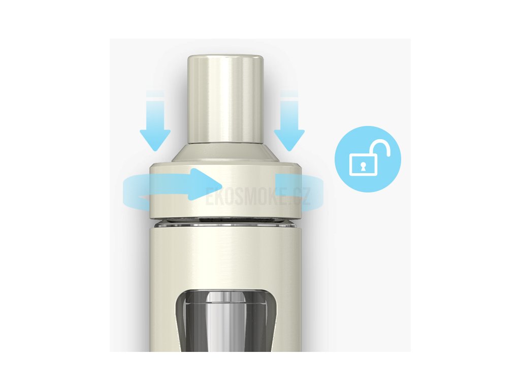 Dětská pojistka Vrchní odnímatelná část je opatřena dětskou pojistkou (ochrana před nechtěnému otevření). Atomizér (žhavící hlava) již není ve spodní části, jako u většiny ostatních clearomizerů, ale nachází se přímo pod náustkem, kde je i regulace přívodu vzduchu (Airflow) |