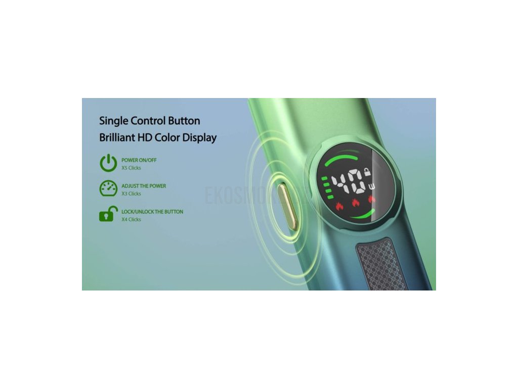 Eleaf iVeni Vás osloví kvalitním kovovým zpracováním a skvělým pocitem v ruce. Disponuje baterií o kapacitě 1100mAh s rychlým 2A nabíjením přes USB-C, takže spojuje styl a efektivitu. Barevný digitální displej jasně zobrazuje výkon, odpor a stav baterie. Díky ergonomickému tlačítku a plnění z boku se snadno používá, a nastavitelný průtok vzduchu umožňuje přizpůsobit si zážitek z vapování. S maximálním výkonem 40W iVeni nabízí silný a uspokojivý vapingový zážitek.