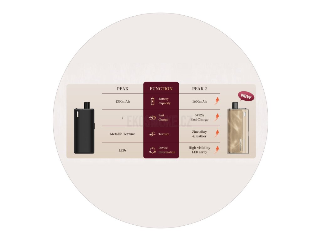 Nástupce populárního MTL modelu Peak od výrobce GeekVape se představuje s luxusně zpracovanou konstrukcí těla, která působí jako skutečné umělecké dílo. Inspirováno uměním designu ve spojení s dlouhou výdrží a jednoduchou obsluhou, to je GeekVape Peak 2. Tělo je nově poháněno integrovanou baterií o kapacitě 1600mAh a výkon je nastavován zcela automaticky ihned po připojení cartridge. Stav baterie si kdykoliv ověříte v reálném čase díky boční světelné indikaci a milovníky velké kapacity potěší přítomnost cartridgí Peak Pod s objemem 4 ml a pohodlným vrchním doplňováním. GeekVape Peak 2 cílí na jednoduchost a styl, který jinde nenajdete, jedná se o vymazlenou a plně automatickou e-cigaretu s co nejsnazší obsluhou a využitím na každodenní šlukování.