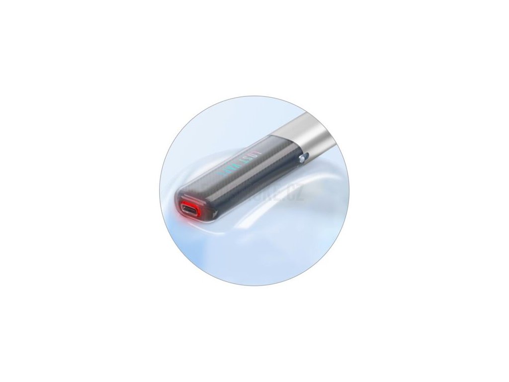 Přímo u dobíjecího portu se nachází také samotná LED indikace, díky které budete mít neustálý přehled o stavu baterie. LED indikace slouží také pro odhalení možných chyb během vapování. Nabídne celkem tři barvy dle aktuální úrovně nabití baterie. V případě plně nabité baterie se rozsvítí zelená dioda, při středním nabití modrá a při brzkém vybití červená dioda.