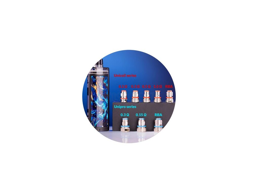 Cartridge Unipro ze základního balení je kompatibilní s kompletní platformou tělísek Unipro Series. V balení na vás potom čekají tělíska Unipro s odpory 0,3 ohm a 0,15 ohm. V případě, že vám nebudou tělíska sedět, je zařízení rovněž kompatibilní s cartridgemi a tělísky ze série Unicoil Series, ve které najdete řadu různých odporů od DL, až po MTL potahování.