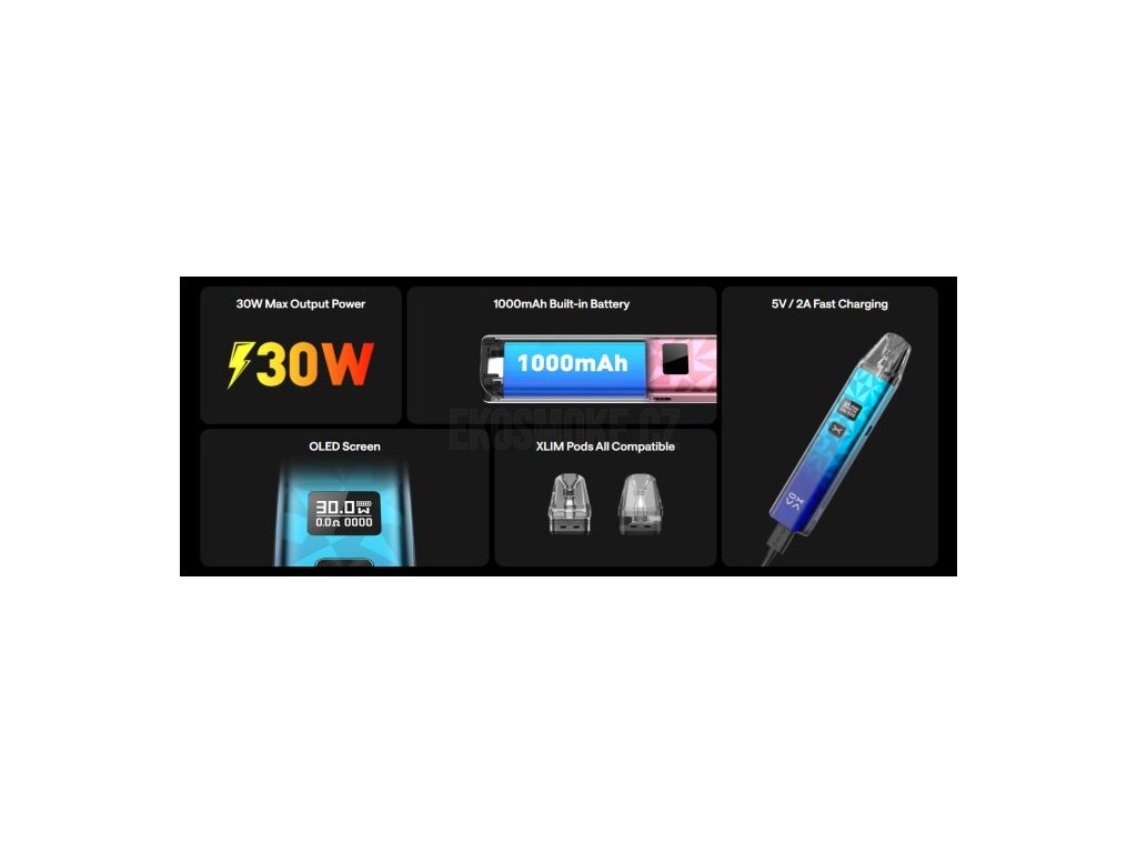 Populární POD systém OXVA Xlim představuje řadu Classic Edition, která vychází z první veleúspěšné řady těchto e-cigaret, avšak nese s sebou prvky nejmodernějšího zařízení. Ergonomické tělo baterie z hliníkové slitiny disponuje integrovaným monočlánkem o kapacitě 1000mAh, který s přehledem vydrží běžnému vaperovi po celý den. O super rychlé nabití se postará USB-C port (5V/2A) umístěný na spodní straně zařízení. Postranní airflow je regulován pomocí speciální páčky, která vám umožní si vzduch nastavit přesně podle vaší chuti. Xlim zároveň disponuje regulovatelným výkonem 5-30W, který můžete sledovat na OLED displeji na přední části zařízení. Pod displejem se nachází ovládací tlačítko, které můžete použít pro sepnutí, nebo využít funkci automatického potahu. V obsahu balení najdete cartridge Xlim V3 s horním plněním - není potřeba vyndavat cartridge z těla baterie při plnění liquidem.