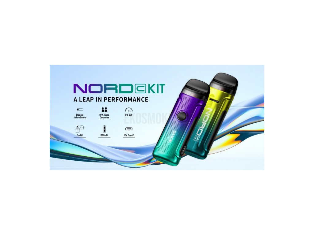 Není určeno pro náplně obsahující nikotin! Smoktech si pro Vás připravil zbrusu nový model elektronické cigarety NORD C, který vás na první pohled zaujme svým futuristickým zpracováním. S tímto ,,parťákem´´ si na cestě vapingu užijete nepřekonatelný DL zážitek za doprovodu té nejlepší chuti liquidu. Kompaktní tělo baterie přináší vestavěný monočlánek o kapacitě 1800mAh, nastavitelný výkon až 50W, inovativní regulaci přívodu vzduchu AFC a rychlé nabíjení pomocí USB-C portu. Na boční straně je umístěn OLED displej, který umožňuje jednoduché nastavení hodnot a zobrazuje všechny potřebné informace. Mezi jeho další přednosti patří ochrana proti zkratu a přehřátí či 8-mi vteřinová ochrana žhavení. Cartridge Nord C o objemu 4,5ml spolupracuje se žhavícími hlavami RPM2.
