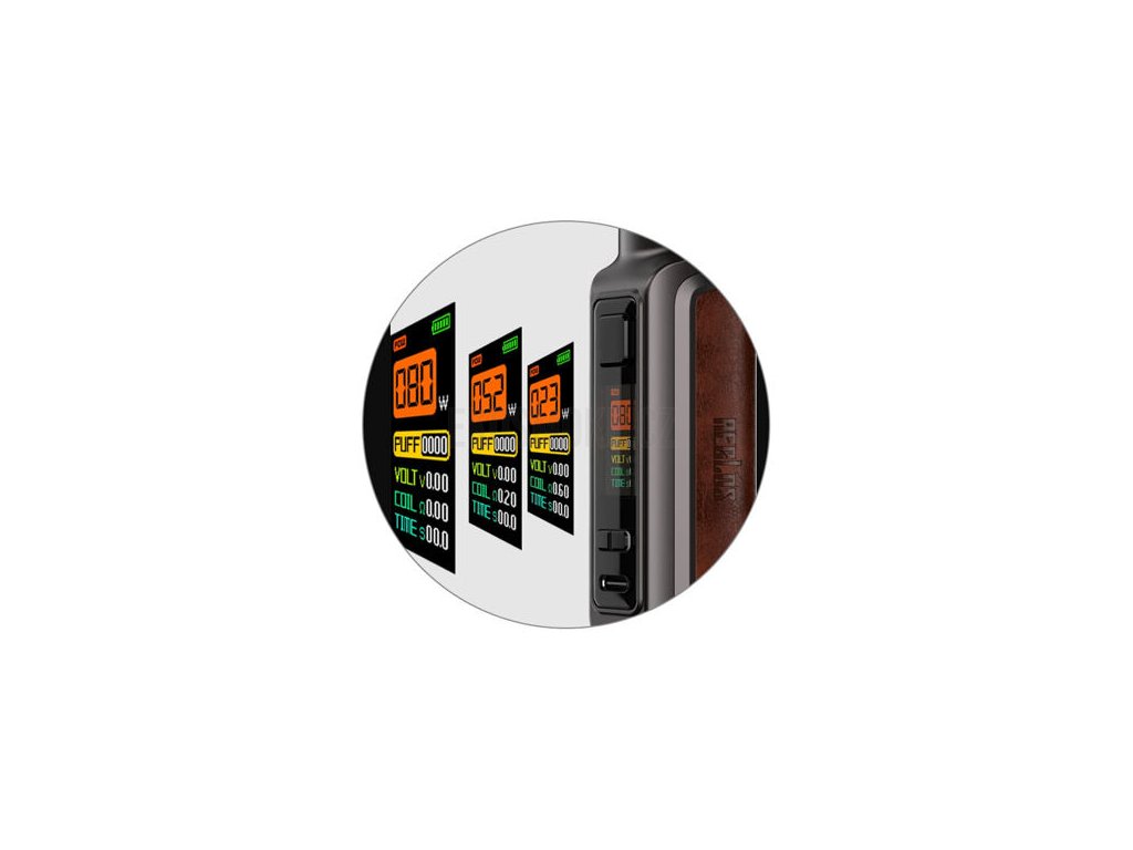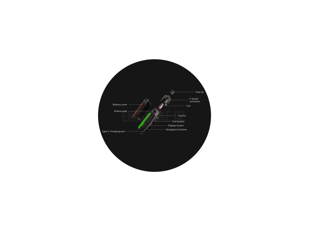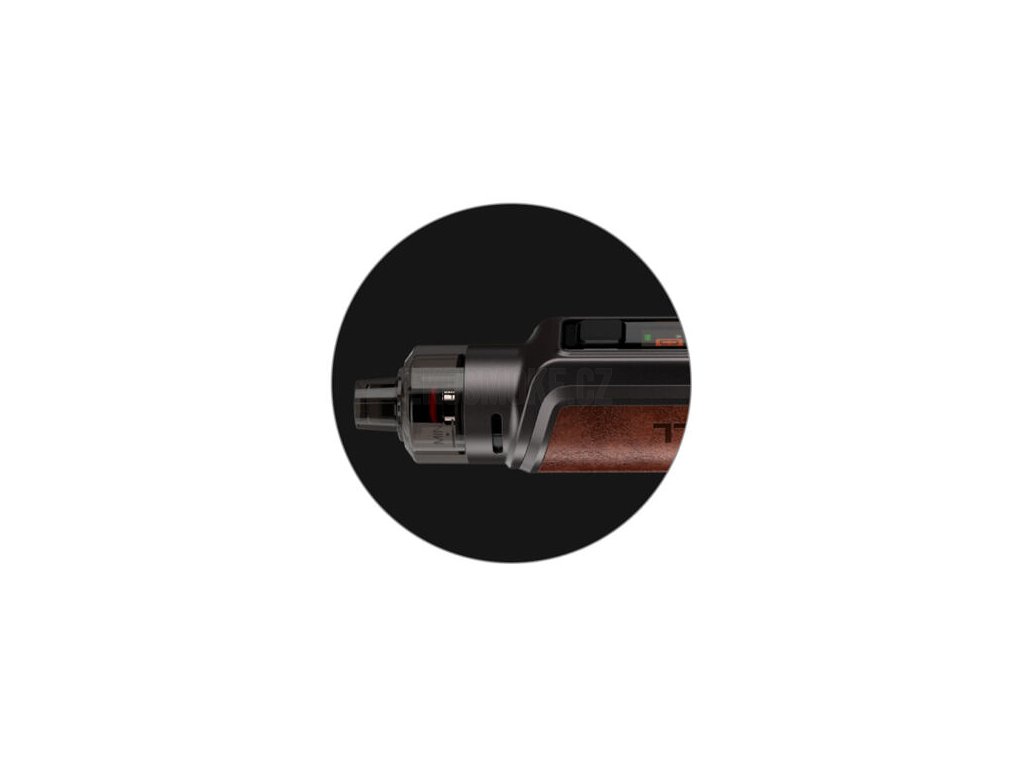 Odklopením zadního krytu objevíte slot pro vložení externí baterie. Zařízení pracuje s jednou baterií typu 18650. Díky pohonu na externí baterii je zajištěn stabilní chod zařízení, rychlý náběh žhavení a možnost využití vysokého výstupního výkonu, jež dosahuje až 80 W. Baterii si navíc kdykoliv pohodlně dobijete přímo v e-cigaretě díky portu USB-C v přední části. Lze ji dobíjet proudem až 2 A.