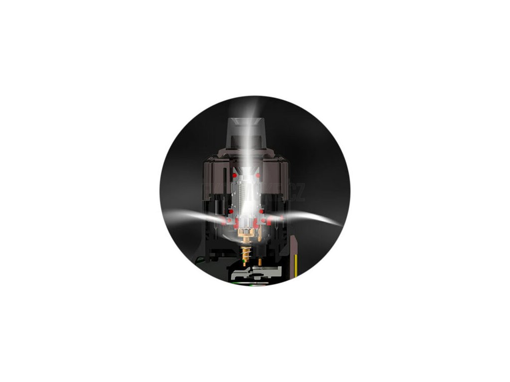 Přímo u kontaktu pro cartridge se nachází airflow otvor, který slouží pro přísun vzduchu do cartridge. Tento otvor je regulovatelný, otáčením cartridge na těle si tak ovlivníte výslednou tuhost, případně volnost potahu a přizpůsobíte si potah svým představám.