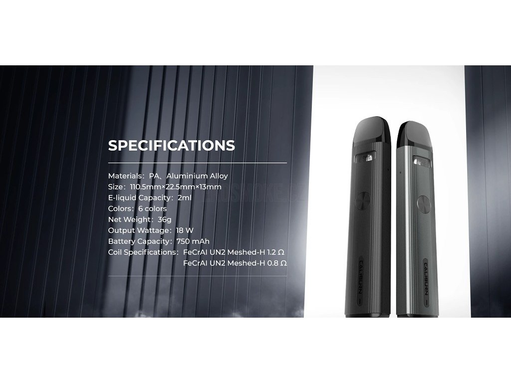 Velmi populární Pod elektronická cigareta Uwell Caliburn G se dočkala dalšího upgrade a přichází tak ve své druhé verzi, se kterou představuje nejen upravený design, ale také vylepšené parametry. V těle z hliníkové slitiny na Vás čeká integrovaná baterie s kapacitou 750mAh, která je vybavena barevnou LED pro přehlednou indikaci zbývající kapacity baterie. Pro rychlé nabíjení je na spodní straně e-cigarety připraven praktický USB-C port. Uwell Caliburn G2 nabízí jak automatický, tak i manuální systém žhavení. Vapování si tak užijete už po pouhém potahu z náustku, případně můžete i podržet tlačítko, se kterým přesně ovlivníte délku žhavení. Velkou změnou oproti předchozímu modelu je možnost nastavit si přívod vzduchu podle svých chutí a potřeb. Už není potřeba otáčet celou Pod Cartridge, samotný pod má nyní integrované kolečko, pomocí kterého nastavíte přesně takovou volnost potahu, jakou máte rádi. Rozměry 110,5mm x 22,5mm x 13mm, objem Pod Cartridge 2ml, konstanstní výkon 18W, materiál hliníková slitina, PA. Barevné provedení Ultramarine Blue.