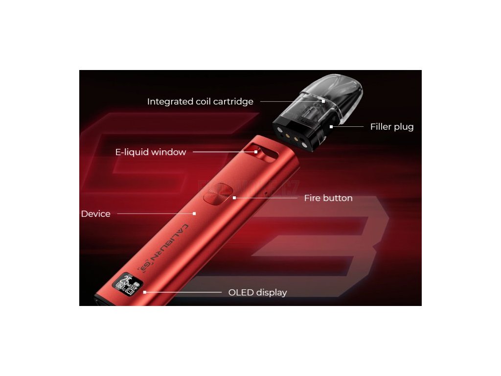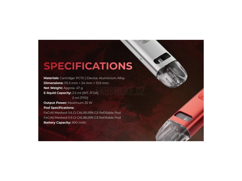 Uwell Caliburn G3 je první POD zařízení z této řady, které podporuje 0,6ohm cartridge, díky nimž si na své přijdou jak RDL uživatelé, tak i milovníci MTL. Tělo baterie je vybaveno monočlánkem o kapacitě 900mAh, OLED displejem, výkonem až 25W a USB-C portem pro rychlé nabití. Cartridge G3 o objemu 2,5ml disponují vestavěnou cívkou o odporu 0,6ohm a 0,9ohm