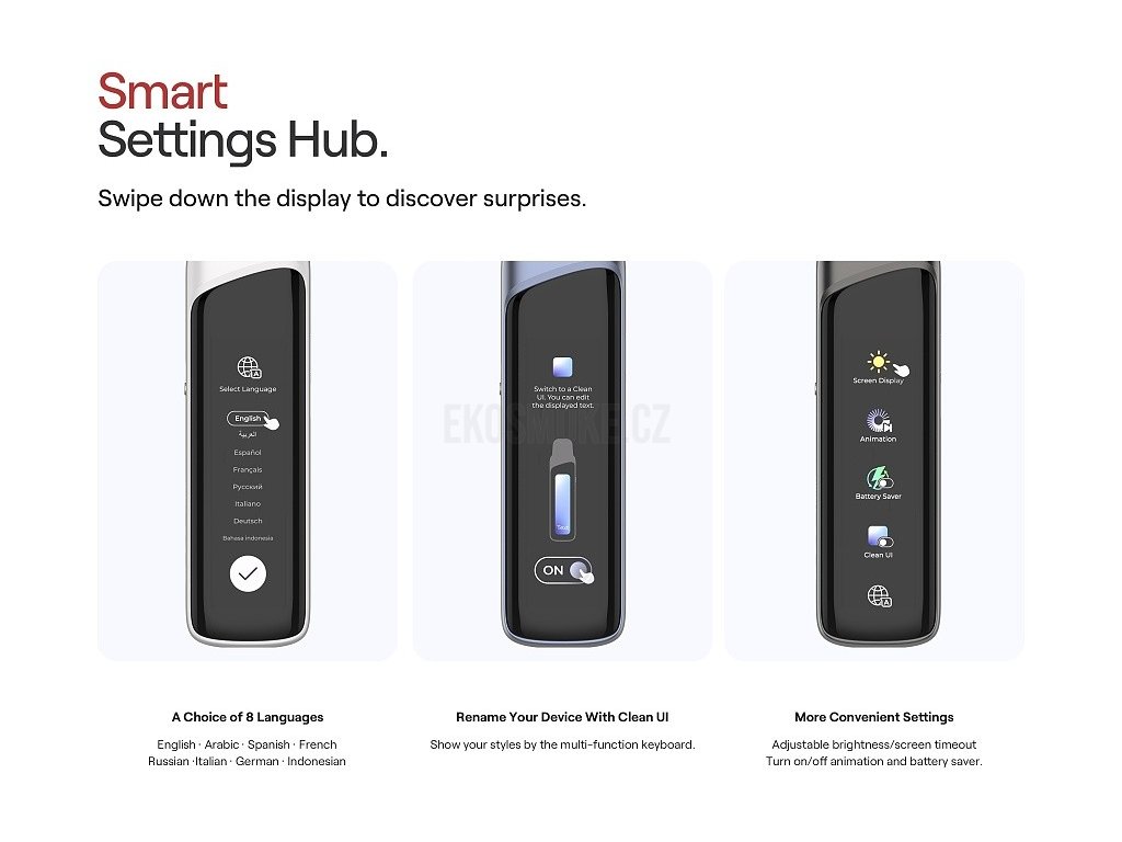 Barevný displejZakulacený HD displej s celobarevným profilem poskytuje přehledné zobrazení všech důležitých informací včetně výkonu, stavu baterie, odporu a nastaveného režimu. Tři různá schémata uživatelského rozhraní umožňují personalizaci podle vašich preferencí. Praktický denní a noční režim s regulací jasu chrání zrak při večerním vapování. |