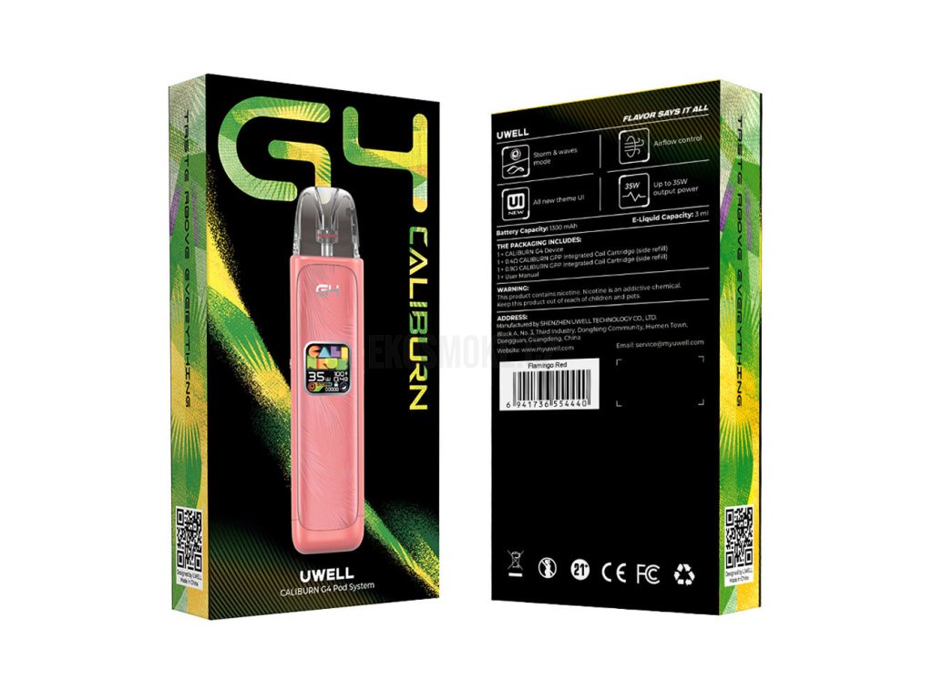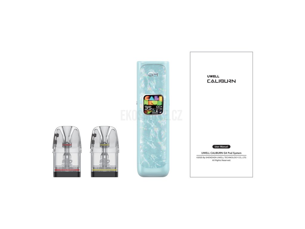Uwell Caliburn G4 Pod Kit je dalším vymazleným Caliburnem s luxusním designovým zpracováním, kvalitní konstrukcí kombinující hliník a ABS a perfektní ergonomií. Konstrukci potom dominuje zakulacený displej na předním panelu a tradiční průzor na stav e-liquidu v horní části. Krásné barevné varianty produktu jsou navíc zárukou, že si model může užívat každý vaper a že si vybere zkrátka každý.