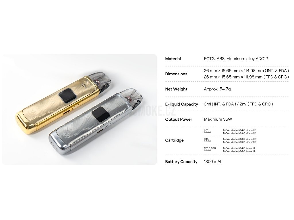 Parametry a specifikaceRozměry: 114.98 x 26 x 15.65 mm Kapacita baterie: 1300 mAh Režimy: STORM / WAVES Metody spínání potahu: automatické & manuální Výstupní výkon: 5 - 35W Způsob nabíjení: USB-C port (5V / 2A) Regulace výkonu: ano Objem Pod Cartridge: 3 ml Styl potahování: MTL / RDL Odpor žhavících hlav v balení: 0.4 Ω / 0.9 Ω Regulace přívodu vzduchu (Airflow): ano Hmotnost: 54.7 g Barva: Glacier Blue (Modrá) Materiál: hliníková slitina (ADC12) + ABS + PCTG |