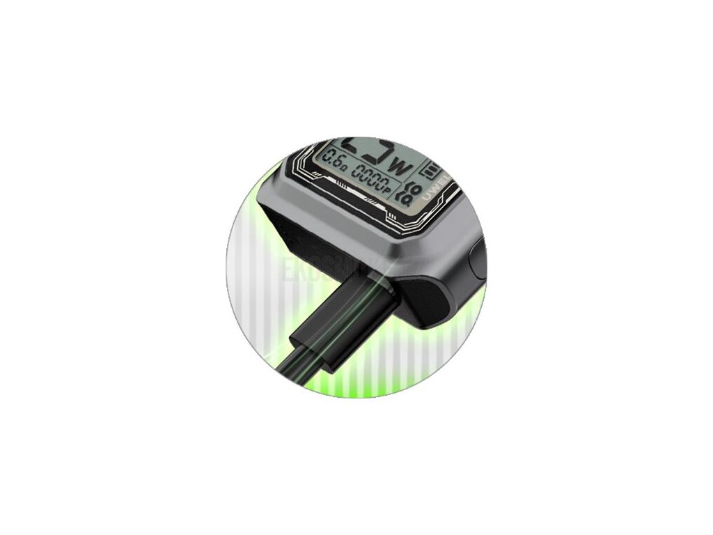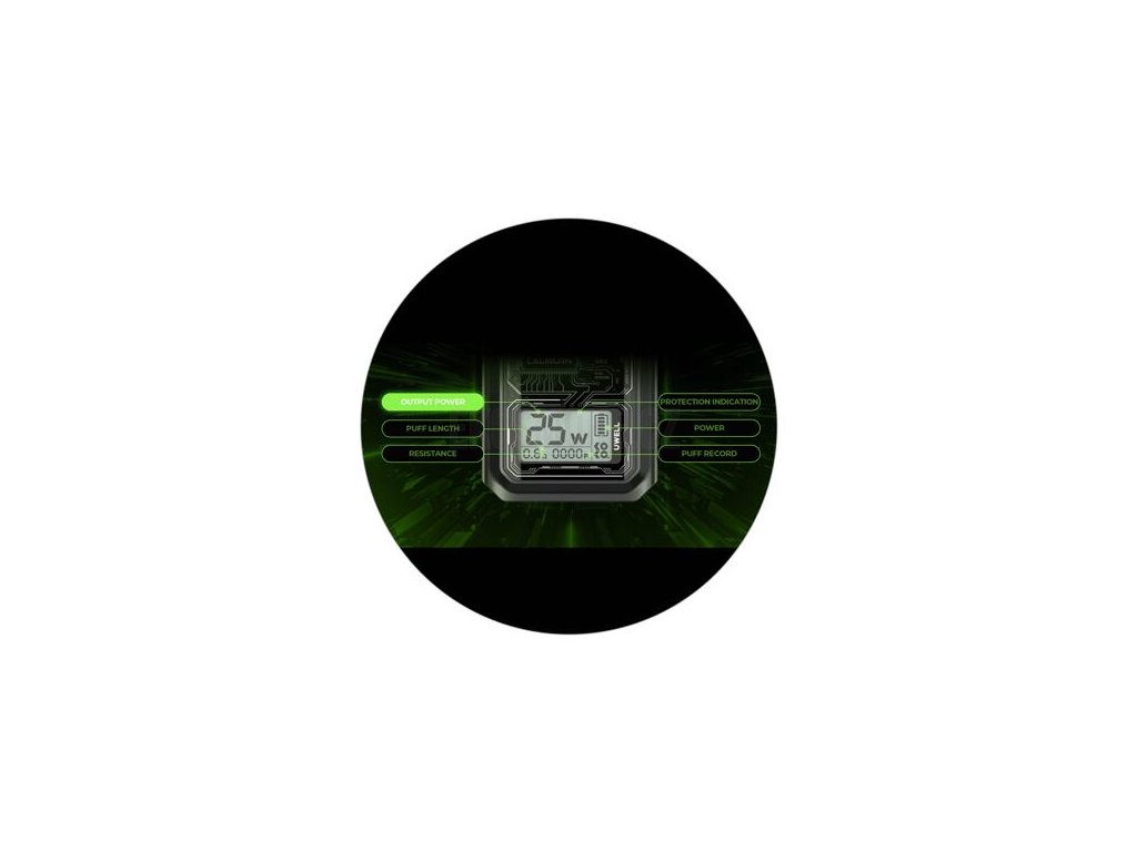 Přední část zdobí krásný segmentový digitální LCD displej, který umně dokresluje celkový vzhled zařízení. Výhodou segmentového displeje je zejména nižší odběr energie během používání, displej tak značně šetří vaši baterii, kterou spotřebováváte téměř výhradně pouze vapováním. Na displeji budete mít navíc neustálý přehled o všech potřebných parametrech během používání.