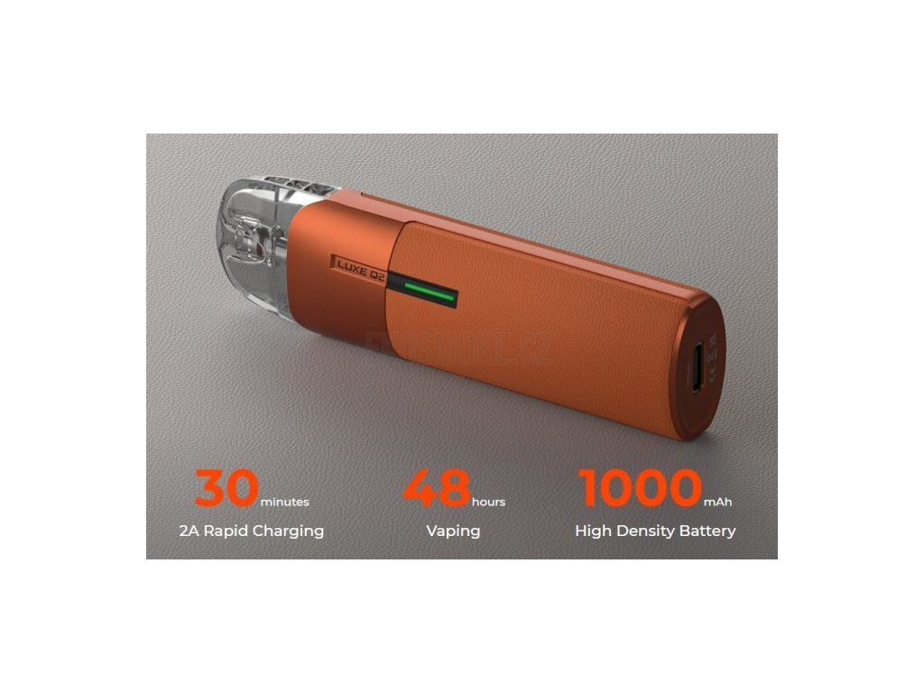 Elektronická cigareta Vaporesso LUXE Q2 se vyznačuje precizně zpracovaným tělem baterie z kvalitní hliníkové sliny a luxusní kůže. Vestavěný monočlánek o kapacitě 1000mAh obsahuje LED indikátor stavu nabití, USB-C 2A rychlé nabíjení a technologii COREX Heating Tech - příjemný vaping v kombinaci husté páry a vyladěné chuti liquidu. Vestavěná baterie disponuje kapacitou 1000mAh s USB-C nabíjením. Na boční straně se nachází inovativní regulace přívodu vzduchu pro MTL a DL vapování. Vyměnitelné cartridge (POD) o objemu 2ml nabízí oblíbený odpor 0,6ohm a 1ohm.