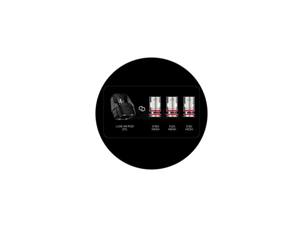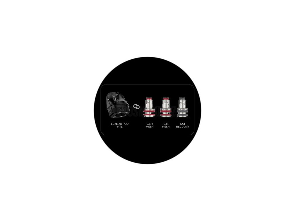 Cartridge XR Pod v základním balení je kompatibilní se žhavícími hlavami z platformy GTX. Tato platforma nabídne celou řadu různorodých odporů a typů žhavících hlav. V základním balení na vás čeká tělísko GTX Mesh s odporem 0,2 ohm a GTX Mesh s odporem 0,4 ohm. Model LUXE XR MAX je zároveň zpětně kompatibilní také s cartridgemi LUXE X s integrovanými hlavami, které se dají pořídit samostatně.