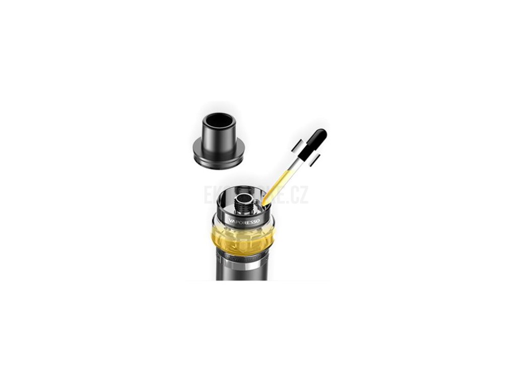 Tank nabídne velký objem 3,5 ml, který si bez problému poradí s několikahodinovým intenzivním používáním bez nutnosti plnění. Pokud však na plnění přeci jen dojde, potěší vás přítomnost praktického vrchního systému doplňování. Jednoduchým pohybem odšroubujte vrchní uzávěr a doplňujte e-liquid podle potřeby. Ve vrchní části je potom umístěn speciální bazének, který zabrání možnému úniku po stěnách atomizéru při případném přeplnění tanku, lze ho tedy efektivněji udržovat v čistotě.
