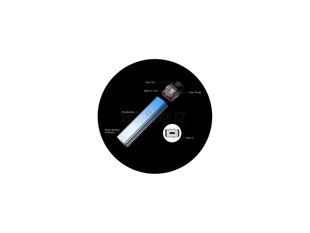 Uvnitř kompaktního těla e-cigarety se nachází integrovaná baterie se solidní kapacitou 1000 mAh, která si poradí s až celodenní výdrží. Baterii můžete kdykoliv pohodlně dobíjet prostřednictvím portu USB-C přímo na těle e-cigarety. Zajímavou novinkou je také přítomnost neonové LED diody umístěné ve spodní části, která nejen příjemně dokreslí celkový design, ale zároveň poslouží jako optimální indikátor stavu baterie pro včasné dobití.