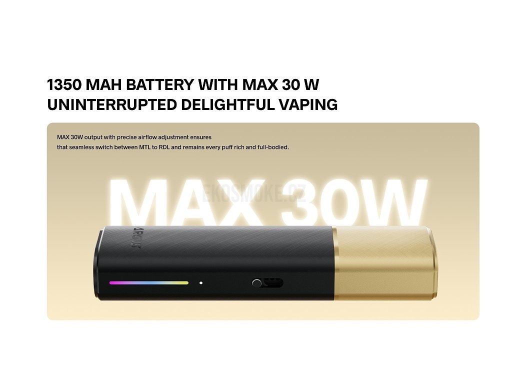 Výkonná baterieIntegrovaná lithium-iontová baterie s kapacitou 1350mAh poskytuje spolehlivou energii pro celodenní vapování. Vysoká kapacita baterie umožňuje stovky potahů na jedno nabití, zatímco pokročilé ochranné obvody zajišťují bezpečný provoz a dlouhou životnost baterie. |