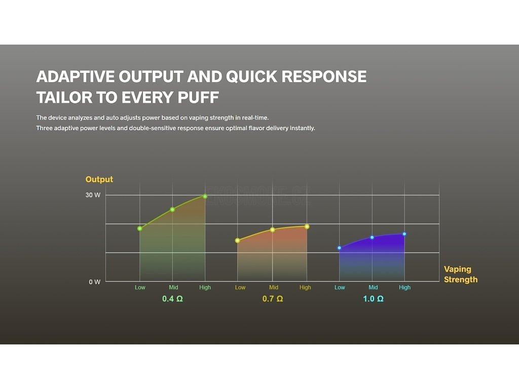 Adaptivní výkonPokročilá technologie adaptivního nastavení automaticky upravuje výkon v rozsahu 5-30W podle typu použitého podu a intenzity potahu. Inteligentní čip vyhodnocuje odpor spirálky a sílu potahu v reálném čase, čímž zajišťuje konzistentní a optimální vapovací výkon bez manuálního nastavování. |