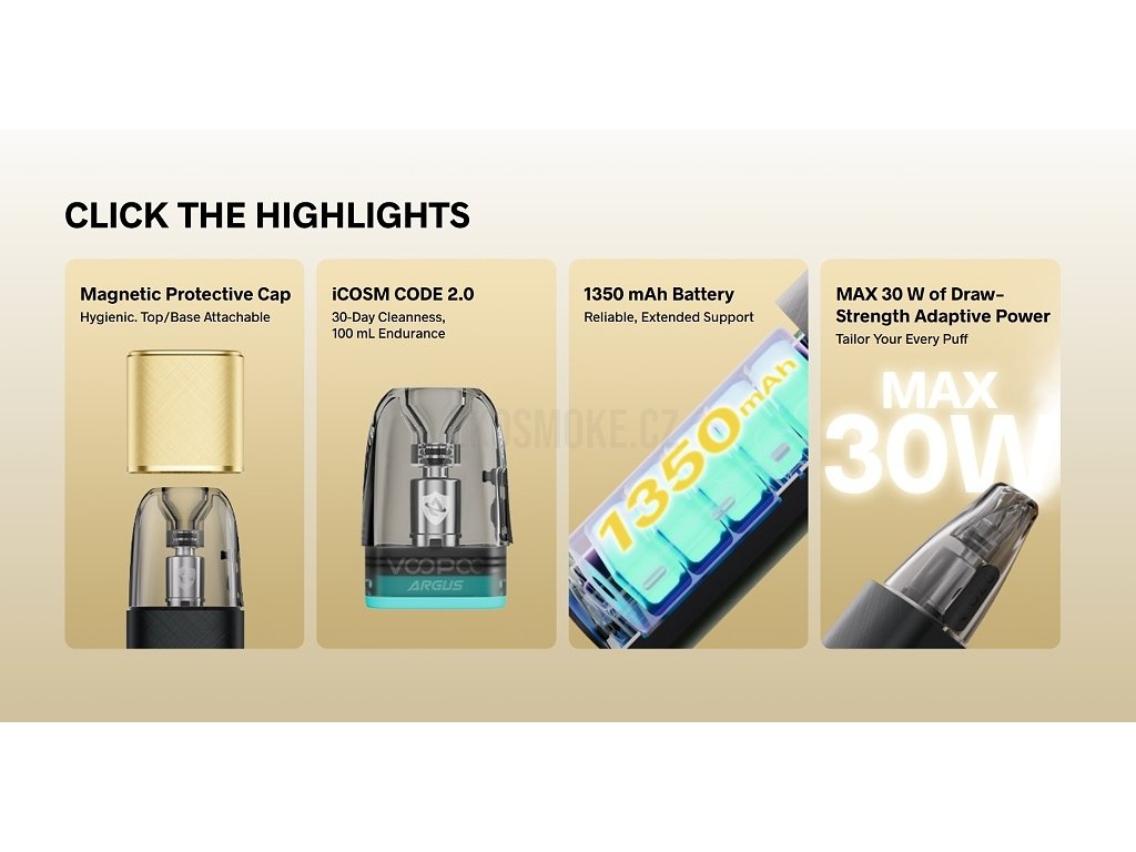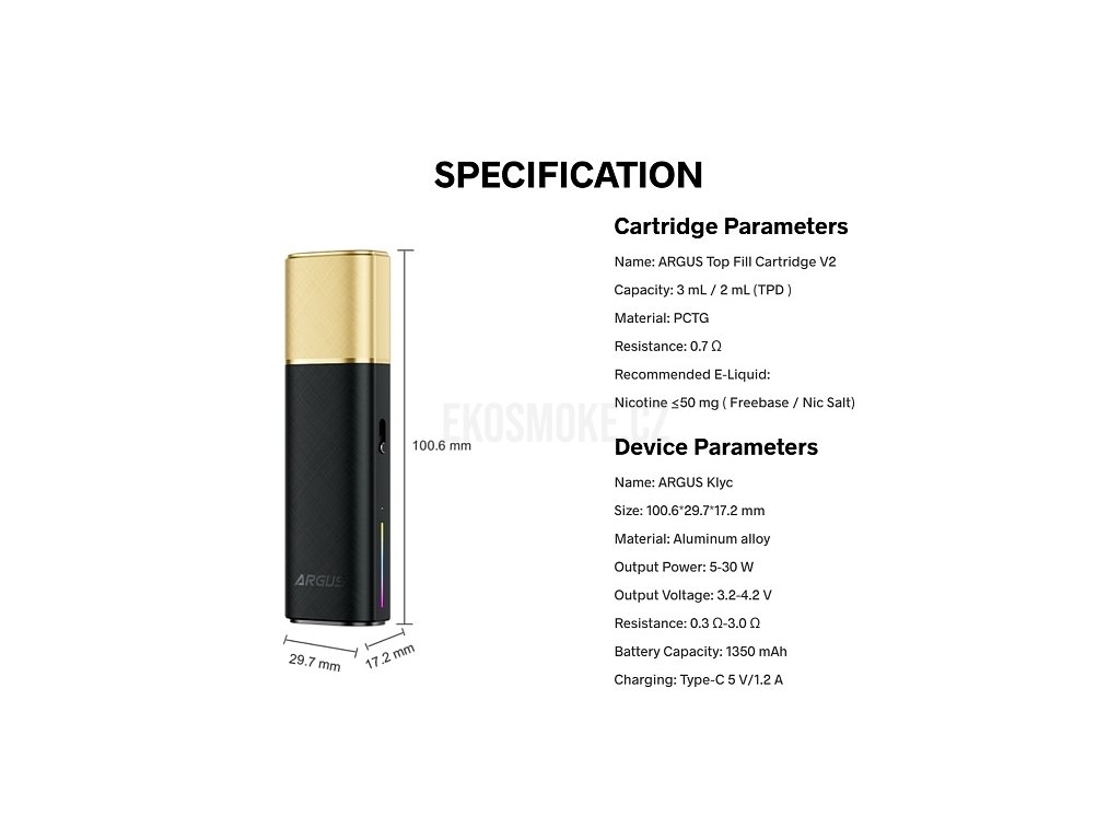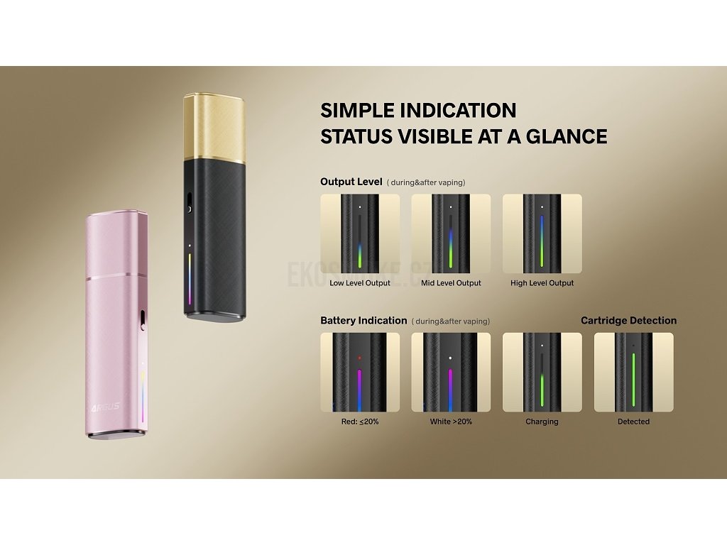 Technologické srdce Argus Klyc tvoří pokročilý čip s inteligentním rozpoznáváním, který vyhodnocuje nejen odpor použitého podu, ale také sílu potahu a automaticky upravuje parametry pro optimální výkon. Technologie iCOSM Code 2.0 zajišťuje efektivní nasycování vaty e-liquidem, rovnoměrné odpařování a okamžité žhavení pro bohatý chuťový zážitek. Praktické vrchní plnění podu eliminuje nutnost vyjímání cartridge z těla zařízení – stačí odklopit silikonovou krytku a doplnit oblíbenou náplň. Ergonomický tvar a kompaktní rozměry 100,6 x 29,7 x 17,2 mm činí z Argus Klyc ideálního společníka pro každodenní nošení. Boční posuvník pro regulaci přívodu vzduchu umožňuje nastavit styl vapování od volnějšího pusa-plíce až po těsnější MTL styl. Magnetické připojení víčka představuje praktické řešení – během vapování jednoduše přichytíte víčko na spodní část zařízení pomocí magnetu, takže se nikdy neztratí. Argus Klyc tak kombinuje stylový vzhled, pokročilou funkčnost a maximální pohodlí používání pro náročné uživatele elektronických cigaret.