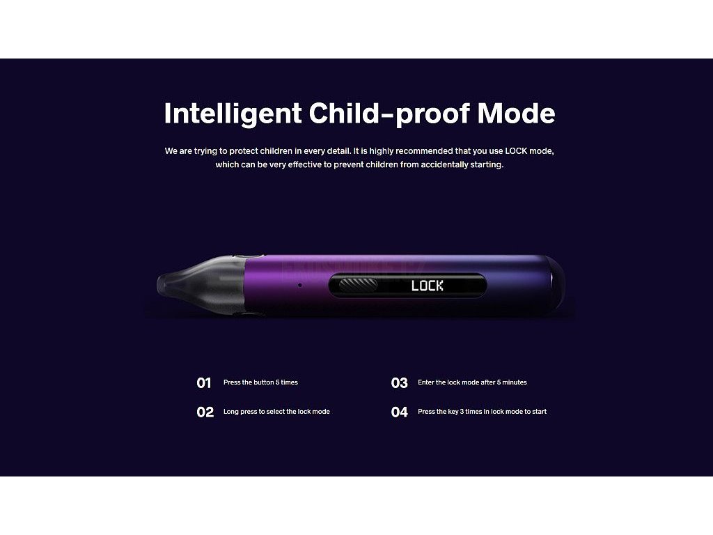 Cigaretu pohání čip GENE, který dodává konstantní výstupní napětí. Těšit se tak můžete na dokonale hladký a příjemný potah, nebo na možnost regulace výstupního výkonu. Ten lze regulovat v rozmezí 5 - 25 W pomocí jednoho jediného tlačítka. Na 0,69 palcovém OLED displeji se zobrazují veškěré potřebné informace o zařízení. Elektronická cigareta disponuje inteligentním režimem dětské pojistky, aby se zabránilo náhodnému spuštění dětmi. Samotná Pod Cartridge disponuje magnetickým uchycením a její doplňování a případná výměna je tak otázkou několika málo vteřin.