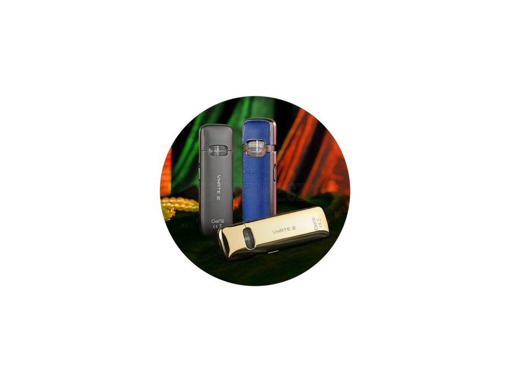 VooPoo VMATE E Pod Kit je luxusně zpracovaná e-cigareta pro klasické šlukování, která nádherně doplňuje celou sérii VMATE. Jedná se o zajímavý model zejména z hlediska estetiky, nabídne však také velice solidní parametry v čele s velkou kapacitou baterie, díky čemuž si její používání velice snadno oblíbíte. Samotné tělo je vyrobeno z kombinace zinkové slitiny a kůže. K dostání je ve třech barvách s tradiční šedou konstrukcí, nebo ve třech barvách pro náročnější, které nabídnou kovovou konstrukci s pozlaceným povrchem pro co nejstylovější vzhled. Rozměry těla činí 99,5 x 30,5 x 17 mm, díky svému ergonomickému zpracování a kompaktním rozměrům padne e-cigareta perfektně do ruky a pohodlně se užívá. Hlavní výsadou je potom speciální krytka náustku ve vrchní části, která zabraňuje vniknutí nečistot při cestování, nebo při každodenním používání, do samotného náustku. E-cigaretu tak můžete neustále udržovat v čistotě a užívat si pohodový vaping naprosto kdykoliv.