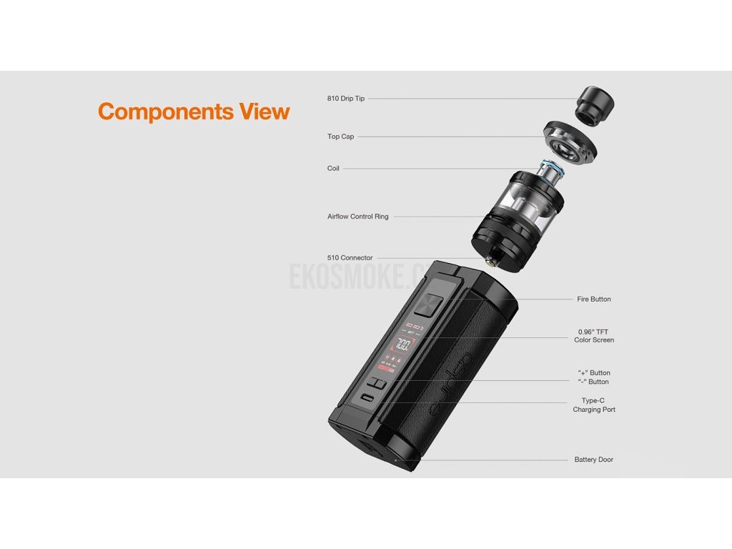 Vysoce výkonný Grip na dvě baterie typu 18650 ze zinkové slitiny a kůže. Výkon až 200W, režimy VW, VV, Bypass, TC, TCR, CPS, počítadlo potahů, možnost změny barvy TFT displeje, závit 510, USB-C nabíjení, ASP čip s řadou ochranných prvků. Clearomizer Aspire Guro 4-5 ml součástí SETU.