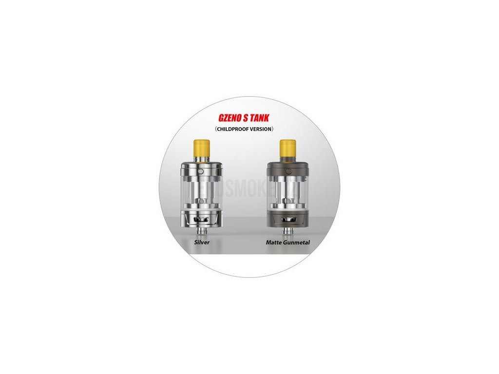 Součástí kompletní sady je nový clearomizér Eleaf GZeno S Tank. Ten přináší vynikající chuťové podání, stejně jako praktické vrchní plnění bez složitého šroubování, pro naplnění tak postačí pouze pootočit párkrát uzávěrem a začít plnit. Objem tohoto clearomizéru činí 2 ml. Ve spodní části potom najdete otvory pro přísun vzduchu do atomizéru. Tento airflow systém je plně regulovatelný.
