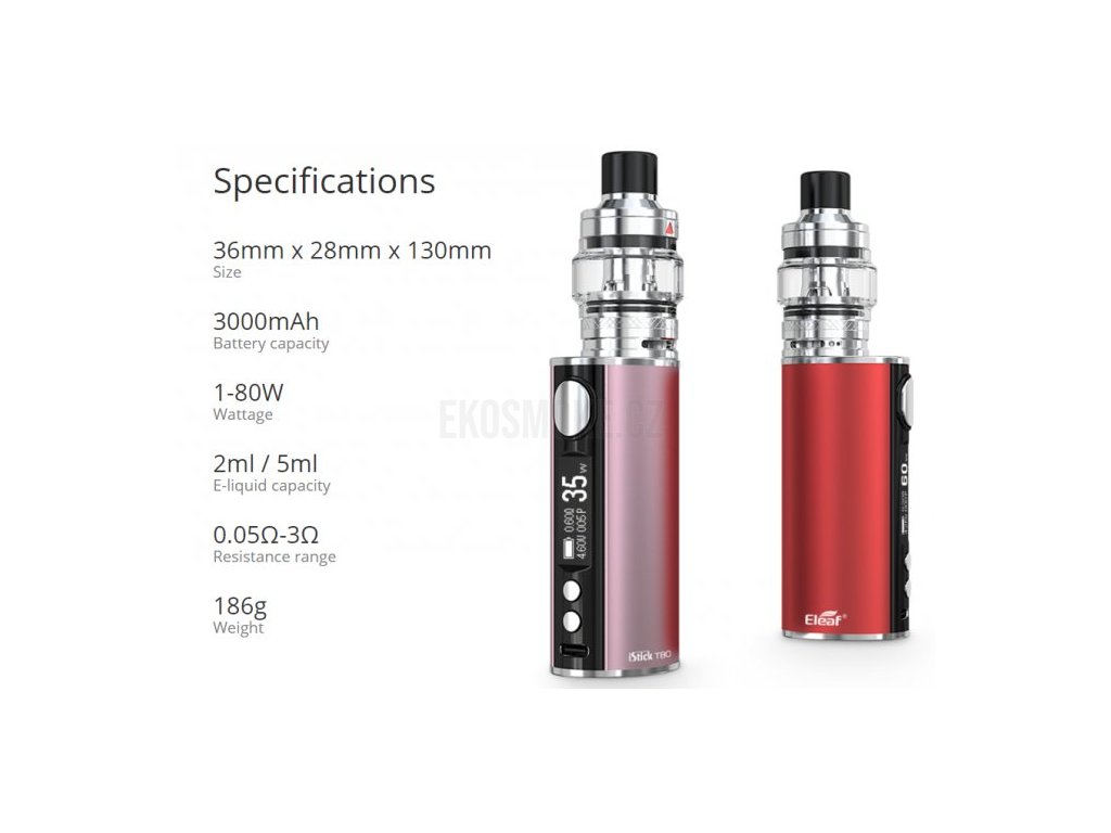 Není určeno pro náplně obsahující nikotin! iStick T80 je novým členem nejpopulárnější a nejoblíbenější řady gripů od Eleaf. Celokovové tělo ukrývá vestavěnou baterii o kapacitě 3000mAh, která je podporována inovativním systémem rychlého nabíjení QC3.0 s dobou nabíjení pouhých 90-ti minut. iStick T80 nabízí nastavitelný výkon až 80W. Přehledný OLED displej nabízí detailní informace o nastavení. Mezi jeho další přednosti patří ochrana proti zkratu, přehřátí, přežhavení, nízkému odporu a 10-ti vteřinová ochrana žhavení. Výrobce k této sadě přiřadil nový clearomizer Pesso s dětskou pojistkou, který vybavil konvexní nádržkou z Pyrexu o objemu 5ml s jednoduchým systémem horního plnění - po odsunutí vrchní části plníte liquid otvorem přímo do těla clearomizeru. Pesso spolupracuje se žhavicími hlavami EF, které nabízejí klasickou kanthalovou variantu o odporu 0,3ohm a čím dál více oblíbenější mesh spirálku o odporu 0,6ohm. Celý clearomizer je plně rozebíratelný = snadná údržba. Regulace přívodu vzduchu pro nastavení optimální kouřivosti se nachází ve spodní části.